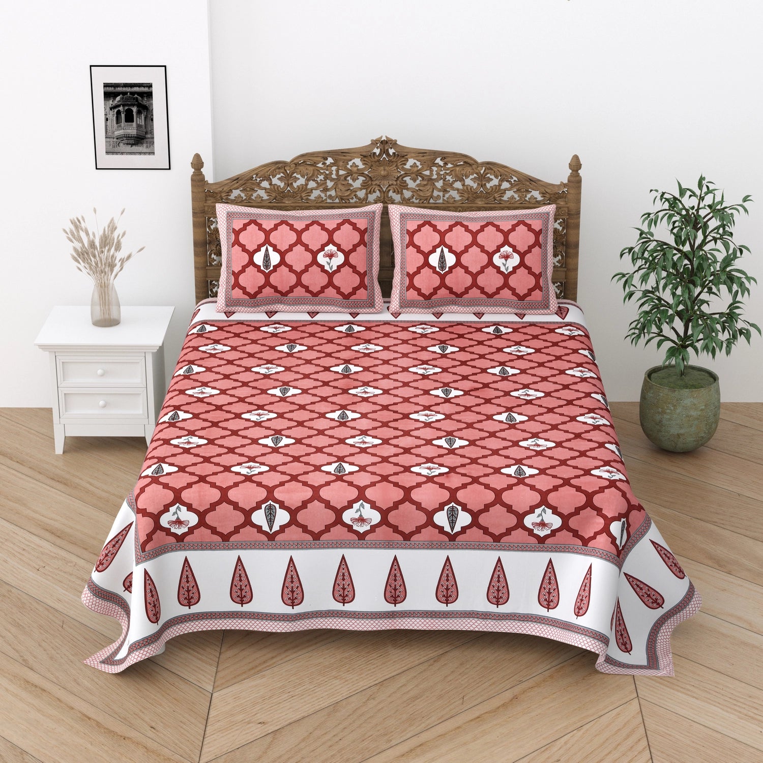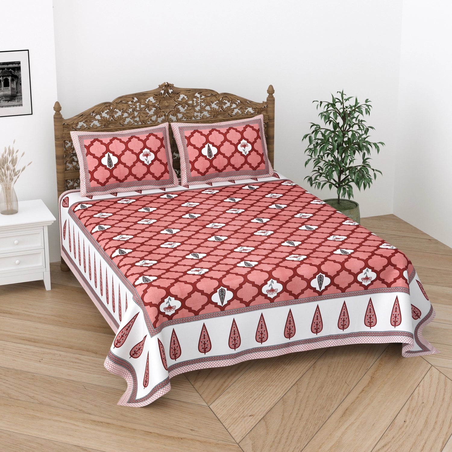 Indulge in the luxury of 100% pure cotton bed sheets adorned with exquisite block prints. Experience the softness and breathability of natural cotton, combined with the timeless artistry of hand-carved wooden blocks. Each bed sheet is a masterpiece, showcasing intricate patterns and vibrant colors that add a touch of elegance to your bedroom. Perfect for a restful night's sleep and a touch of Indian heritage in your home.