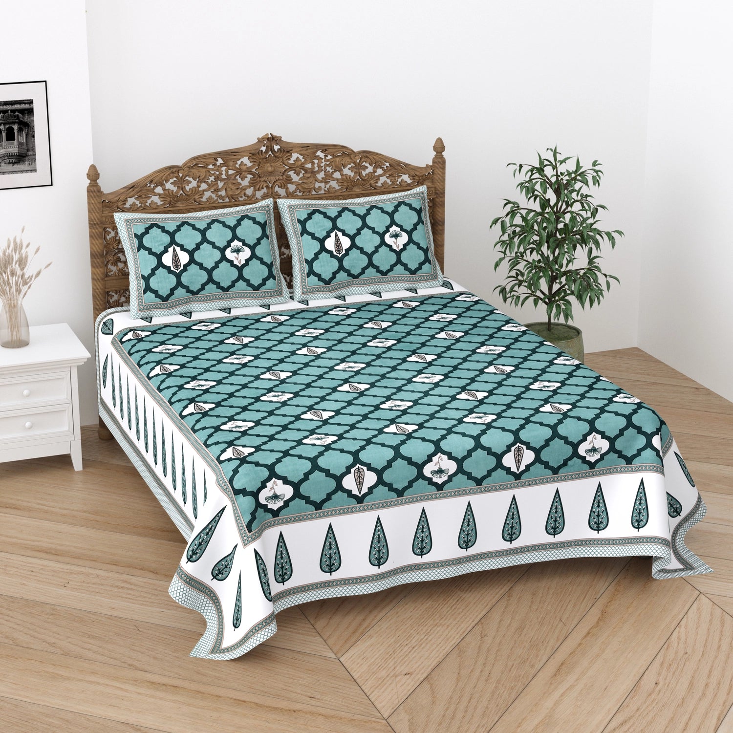 Indulge in the luxury of 100% pure cotton bed sheets adorned with exquisite block prints. Experience the softness and breathability of natural cotton, combined with the timeless artistry of hand-carved wooden blocks. Each bed sheet is a masterpiece, showcasing intricate patterns and vibrant colors that add a touch of elegance to your bedroom. Perfect for a restful night's sleep and a touch of Indian heritage in your home.