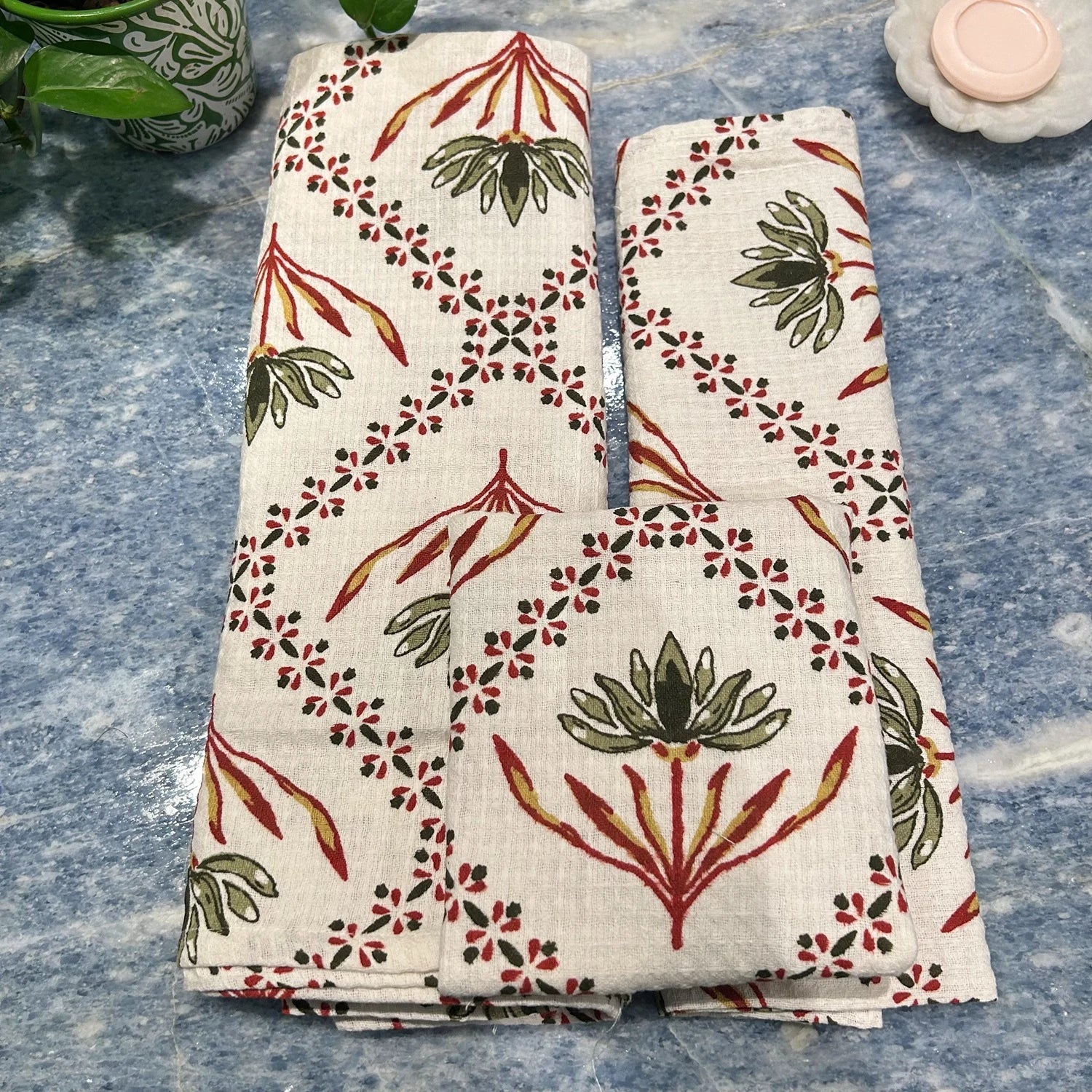 Wrap yourself in luxury with our 100% Waffle Cotton towels. Crafted with care, each towel showcases intricate Block Print designs, adding a touch of artistry to your bath routine. Experience exceptional absorbency and softness, perfect for gentle drying.