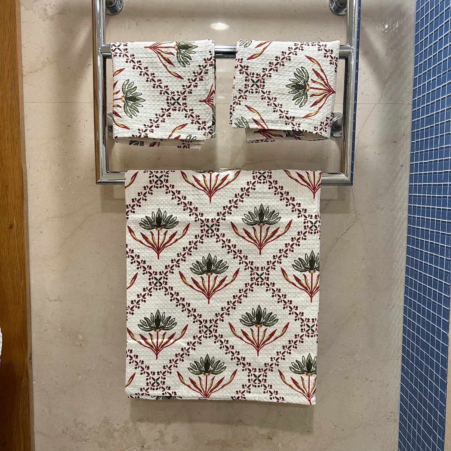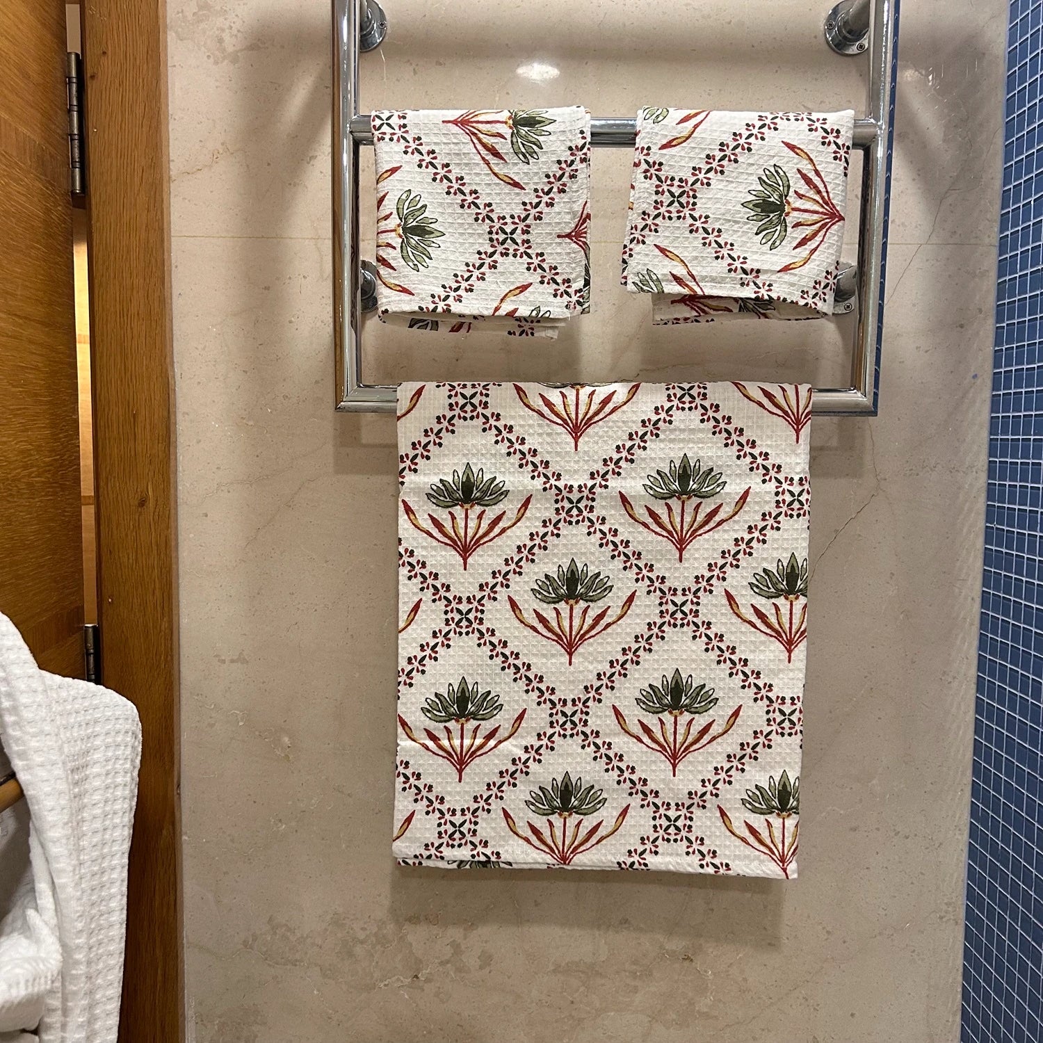 Our towels are a pure combination of waffle cotton and block printing, resulting in exceptionally soft, absorbent, and uniquely patterned bath essentials.